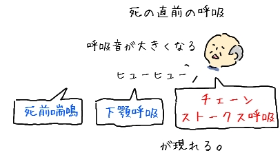 呼吸をするたびに、喉元でゴロゴロと音がする状態(死前喘鳴)になることがある。
