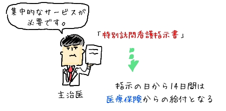 - 急性増悪時に主治医から特別指示書が交付された場合、介護保険から給付が行われる。